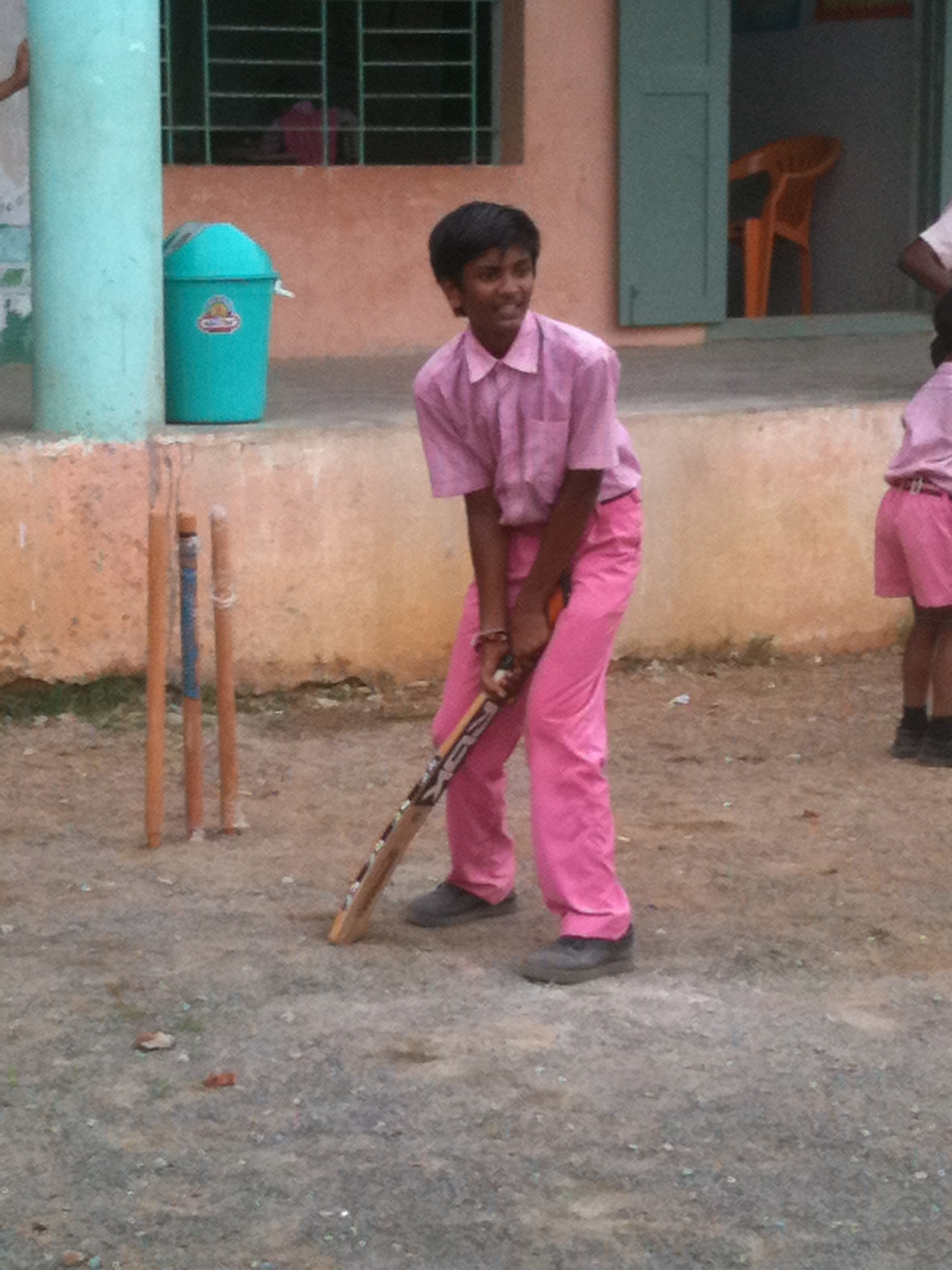 The children have recently changed to a new school uniform, and just before we boarded the bus I was able to play some cricket with a few of the boys. Here's one of them resplendent in his pink outfit: